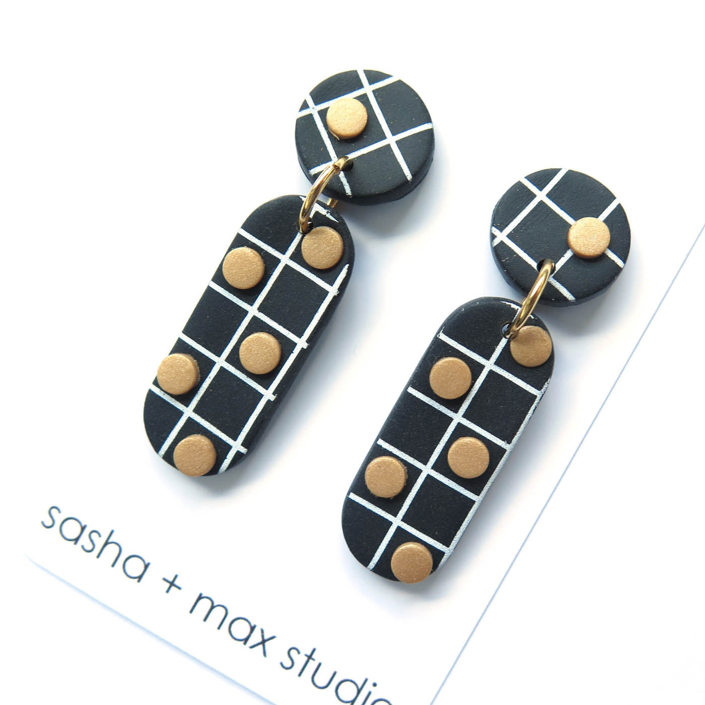 Graphic style black and white patterned polymer clay earrings with metallic gold clay dots - handmade polymer components paired with surgical stainless steel posts.