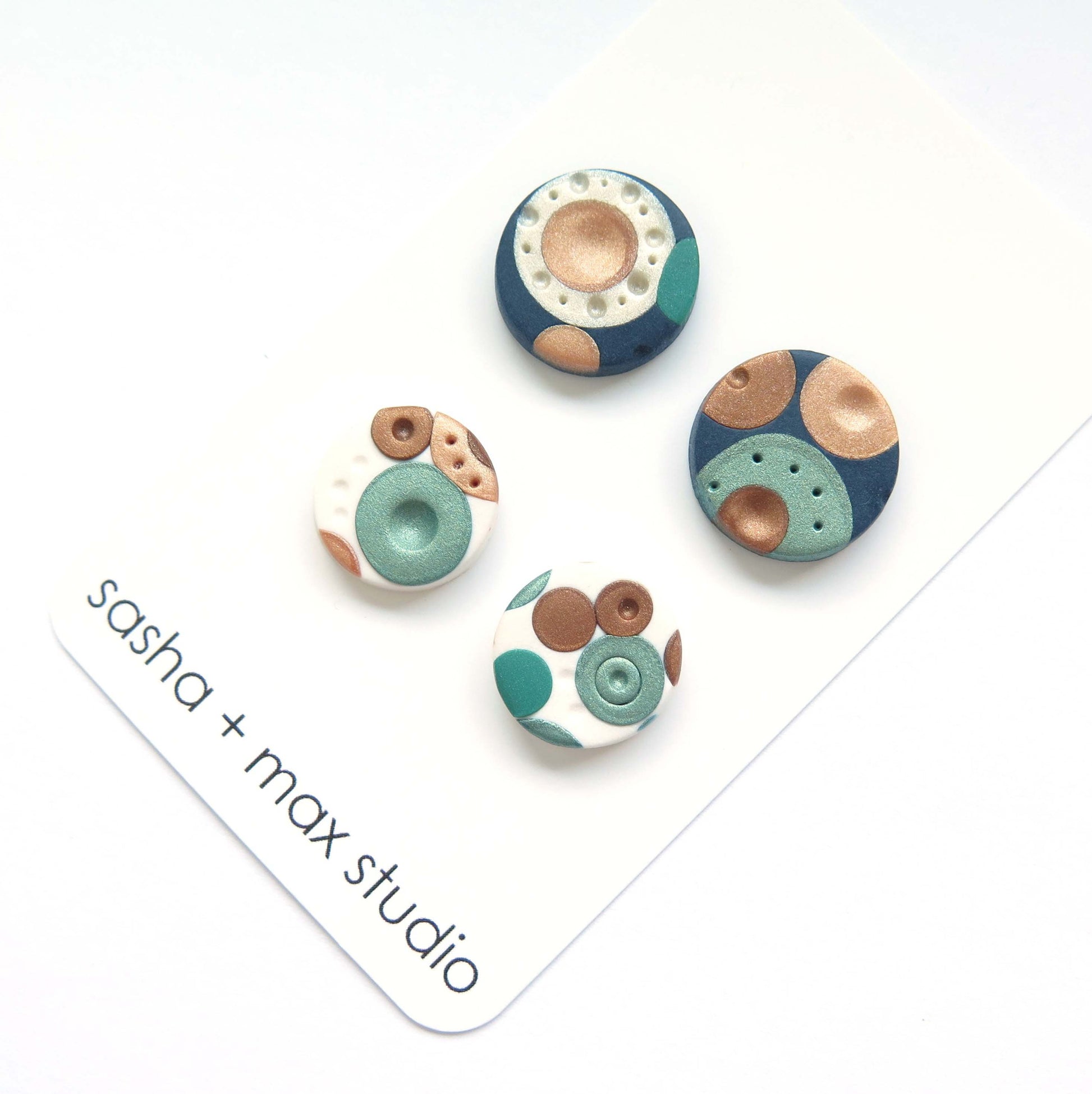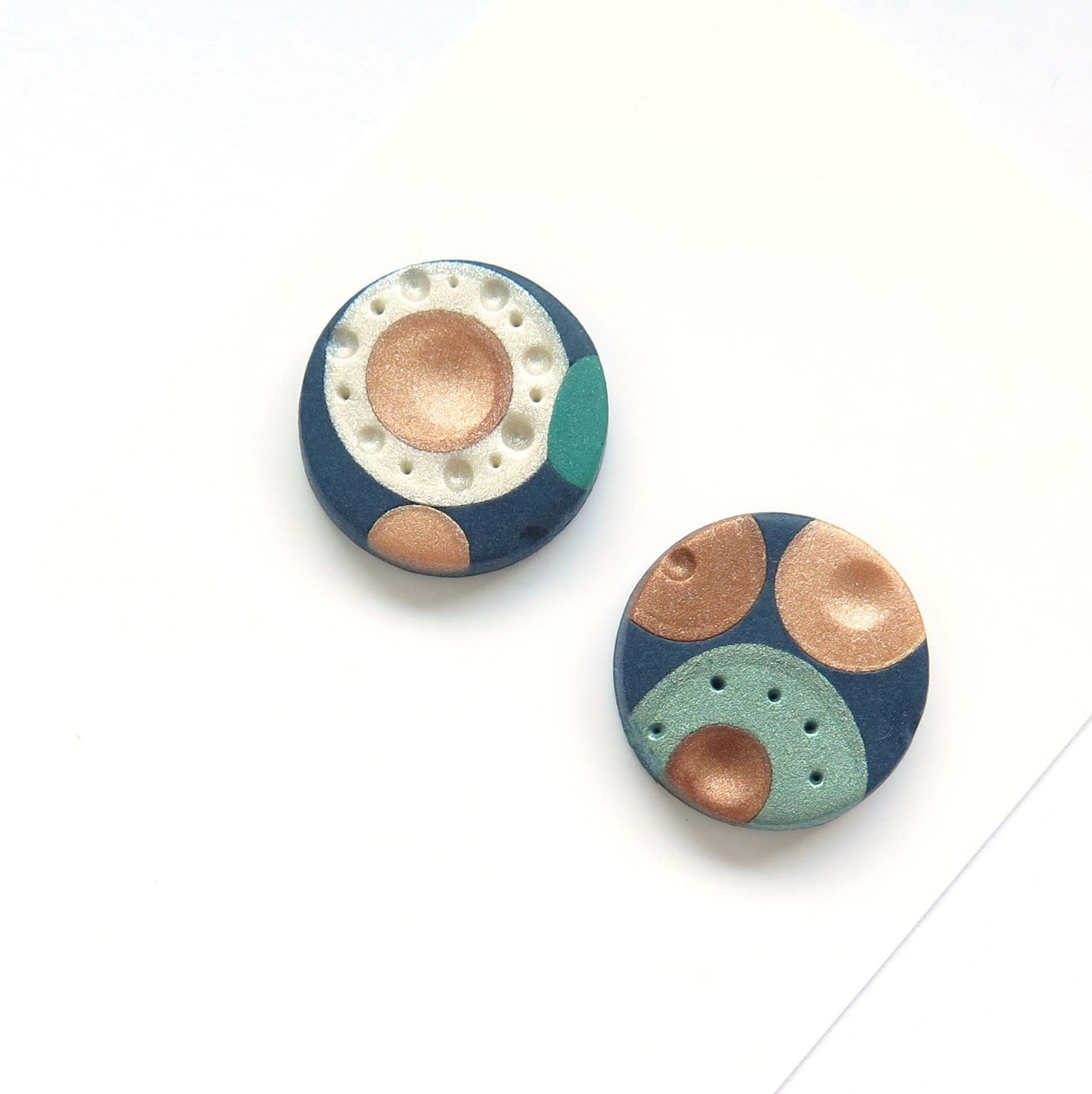 This listing is for 2 pairs of studs : Metallic copper, pearl and green colours on a light navy base.,18mm: and Metallic copper, green colours on a white base, 15mm.