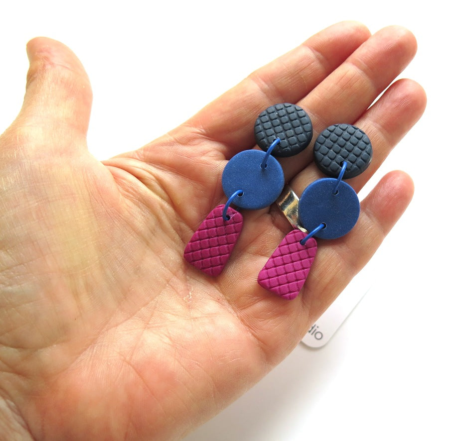 Navy, blue and pink textured clays made with handmade components paired with surgical stainless steel posts and cushion back stops.