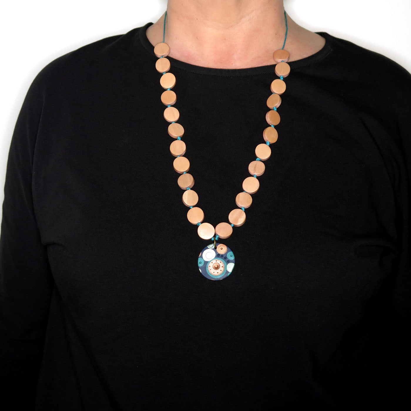 Metallic Dots Pendant Polymer Clay and Wood Necklace