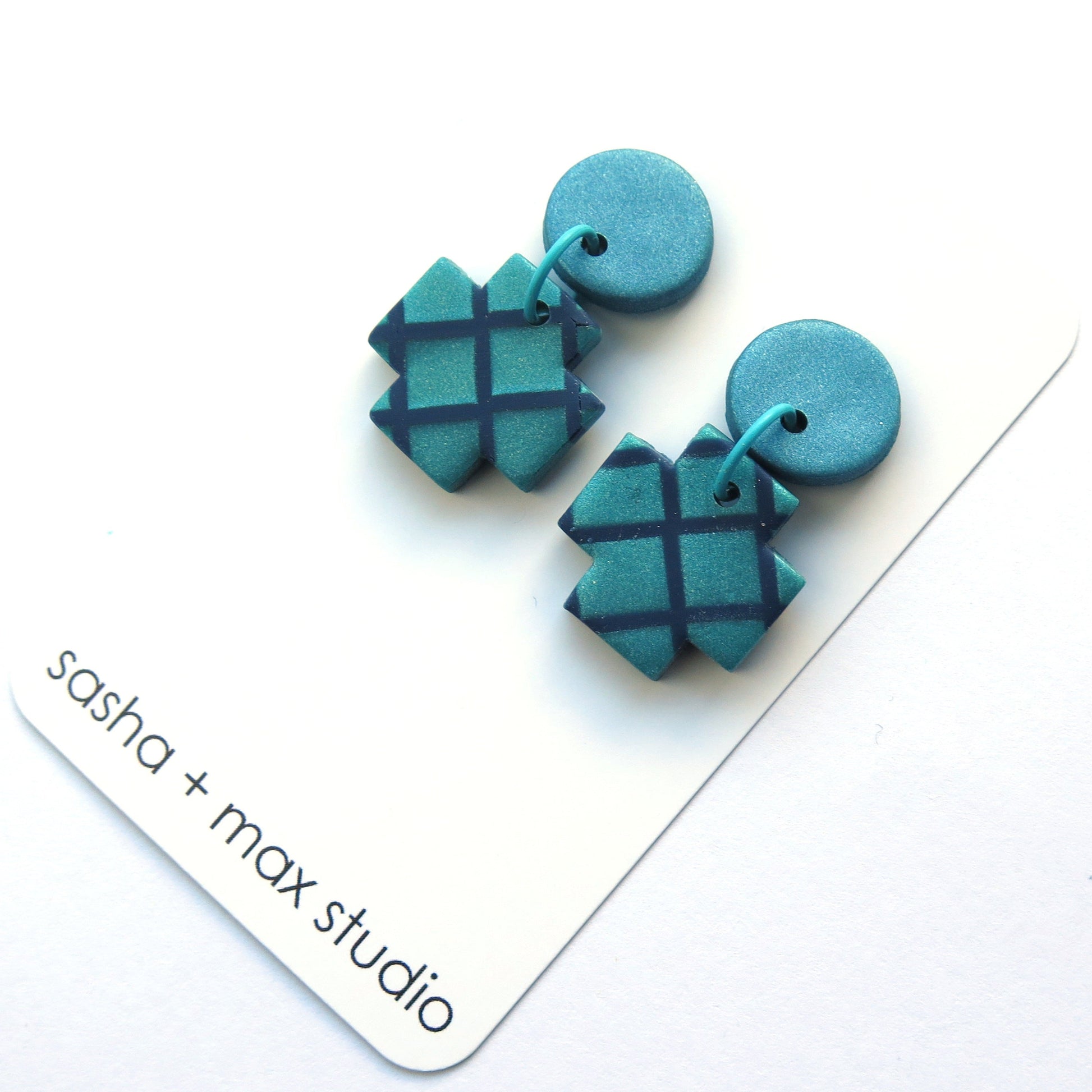 Metallic Teal Grid Cross Polymer Clay statement earrings