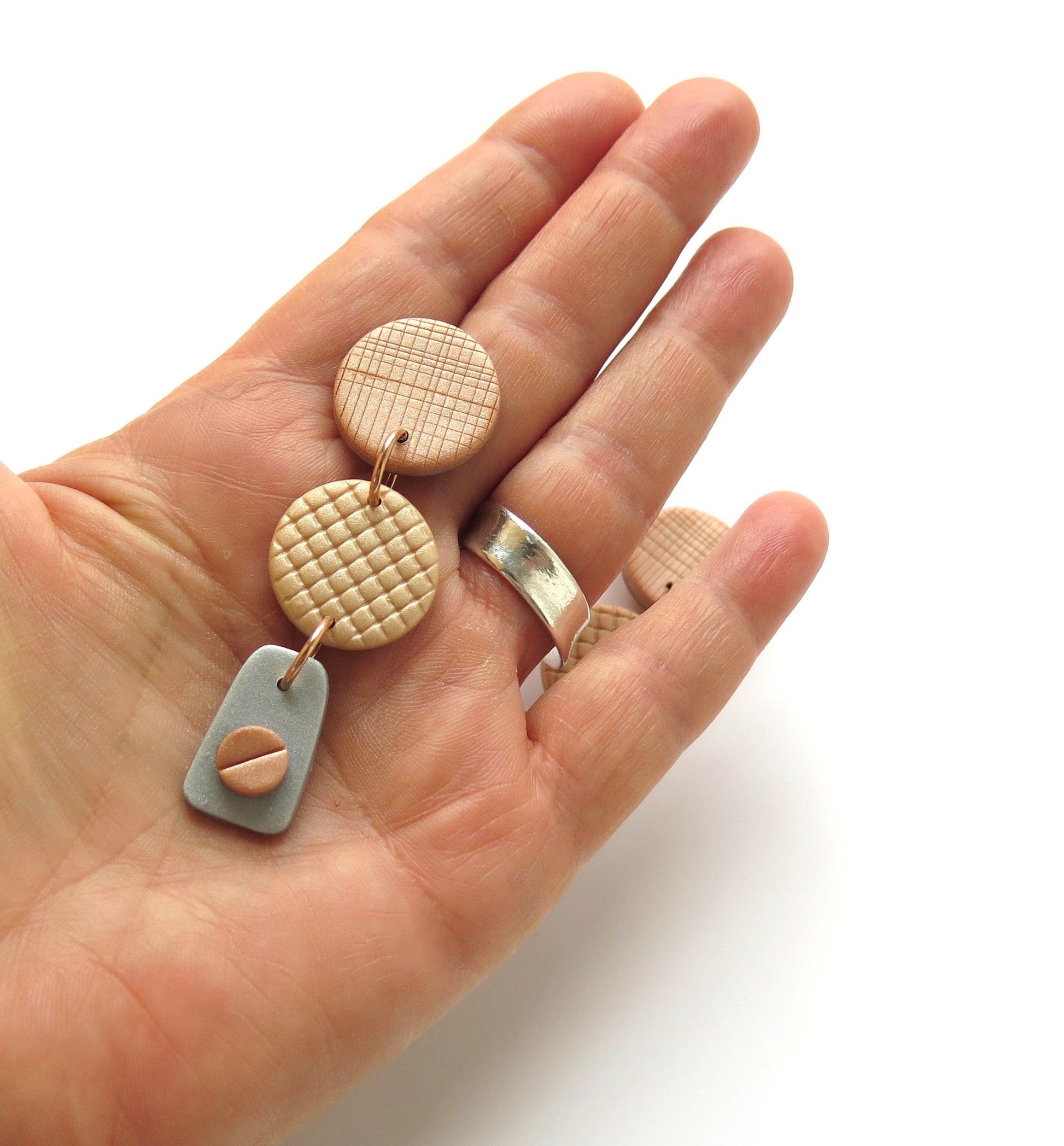 All polymer clay made to imitate metallics, with rose gold plated joining rings.
